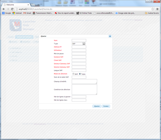 Dans le cas d’une source de données Table SAP, les données proviennent directement d’un table SAP. Vous devez alors préciser un certain nombre de paramètres supplémentaires : le nom de la table, les champs que vous souhaitez récupérer, la condition de sélection des données, le nombre de ligne à passer et le nombre de ligne maximum.