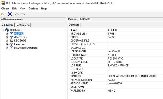 The connection to BDE is done by using the ACE400 database, defined into the BDE Administrator: